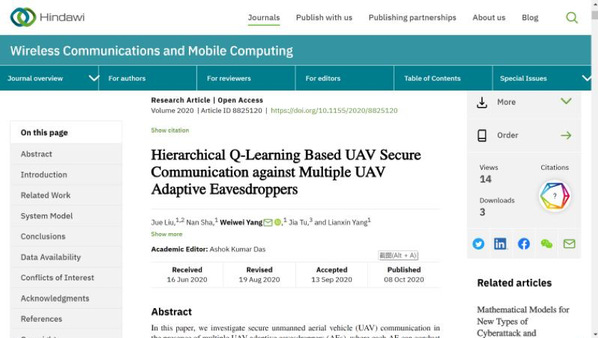 近日,信息学院副院长刘珏副教授以第一作者在SCI检索期刊《Wireless Communications and Mobile Computing》上发表了题为《Hierarchical Q-learning Based UAV Secure Communication Against Multiple UAV Adaptive Eavesdroppers》学术论文。