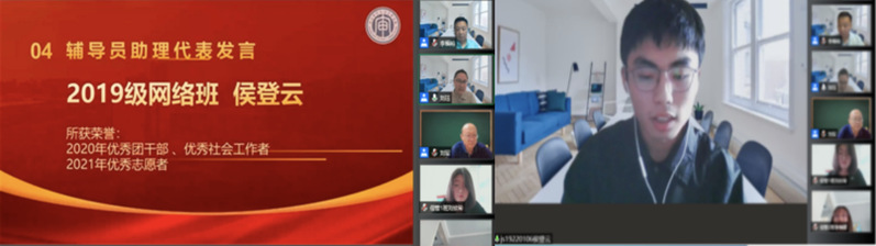 2019级网络班侯登云同学,作为辅导员助理代表,讲述了自己在学习、生活和社会实践方面的经历,表示作为辅导员助理,一定会为新同学们尽快适应校园环境,顺利进入学习生活当好引导、做好服务。希望学弟学妹能够养成自主学习的习惯、学会记笔记、学会充分利用网络资源,能够积极展望未来,扬帆起航。