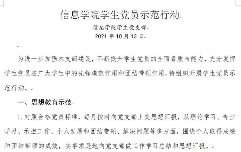 该示范行动明确提出,学生党员要在广大学生中充分发挥先锋模范作用和团结带领作用。示范行动内容主要包括思想教育示范、专业学习示范、全面发展示范和担当奉献示范等四个部分。