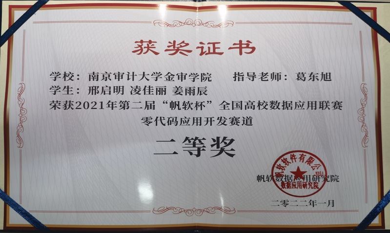 近日,2021年第二届“帆软杯”全国高校数据应用联赛经过近半年的角逐,落下帷幕。信息学院信管专业学生邢启明、凌佳丽、姜雨辰三位同学组成的参赛队伍,在葛东旭老师的指导下,以设计完成的《急救车辆管理系统》,在来自电子科技大学、中南大学等全国84所高校的338支队伍中,取得全国二等奖的好成绩。