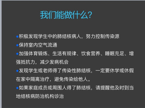 本次主题班会对什么是结核病,肺结核是如何发病和感染的,结核病有哪些症状,如何有效预防结核四个方面进行了详细的讲解。