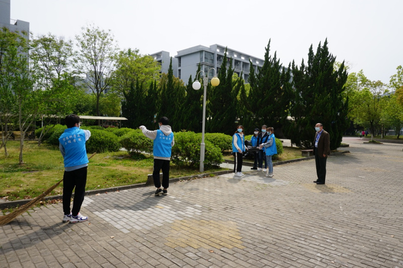 下午两点整,三位老师与同学们在指定包干区前准时集合,在刘教授简单介绍活动内容并分配完任务之后,志愿者们便穿上志愿马甲,拿上垃圾袋、扫帚、一次性手套,前往自己所负责的区域进行环境打扫清理。