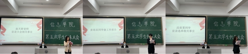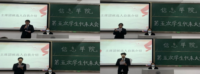 主席团候选人依次进行竞选演讲,演讲结束后,全体代表投出了手中庄严的一票,赵天舒老师宣读了四位候选人最终票数,并公布张凤、汪靖荃和廖俊为信息学院学生会轮值主席。