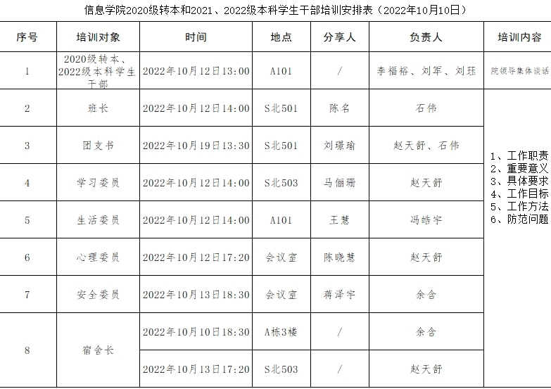 见面会后,学院针对班长、团支书、学习委员、生活委员、心理委员等岗位,分别展开了专项培训活动。培训会上,都安排了在各岗位经验丰富的学长学姐进行了经验分享与交流,同时由各自负责的辅导员老师对各个岗位的职责与工作要点进行专题培训。
