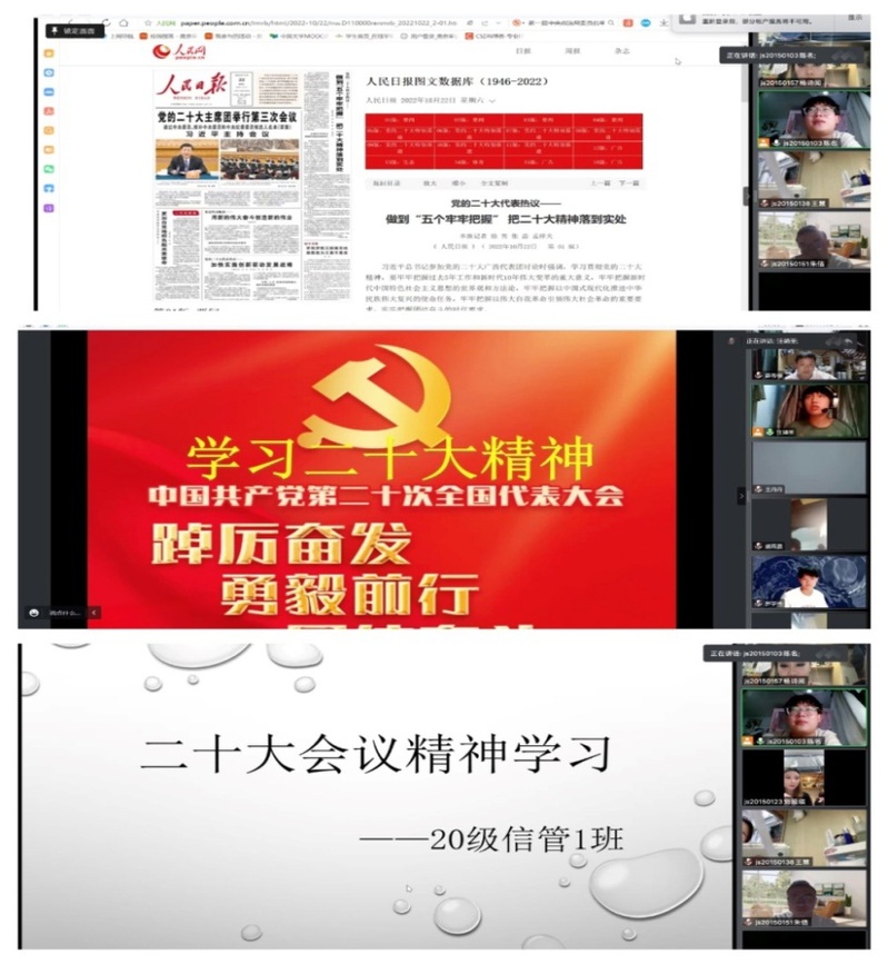 全院各班级相继开展了“我眼中的二十大”主题征集和学习党的二十大精神主题班会活动,同学们通过撰写文章、拍摄短视频等形式讲述自己眼中的党的二十大,通过在班会上边听边做记录,就报告中的新提法、新思想进行了交流和探讨,大家通过诵读报告内容,撰写学习心得,深刻领会党的二十大精神的内涵与意义。