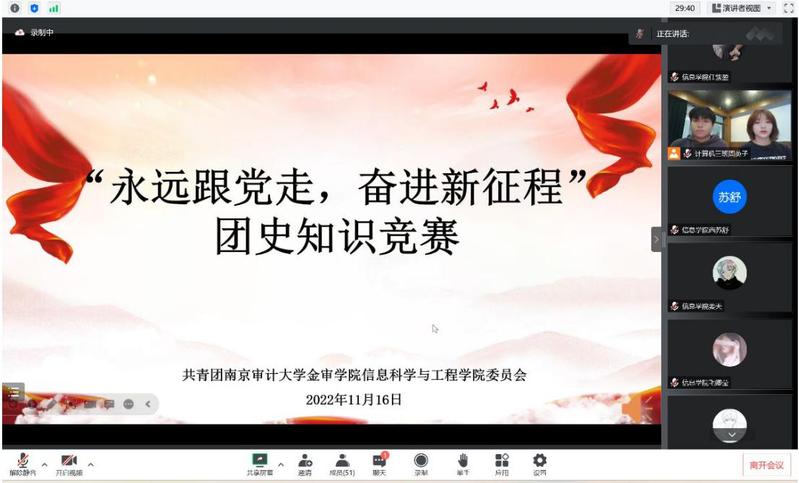 为帮助同学们全面了解团史知识,进一步继承和发扬团的优良传统,加强青年团员意识,引导广大青年从内心深处厚植对团的信赖,11月16日晚,由校团委主办、信息学院分团委承办“永远跟党走,奋进新征程”团史知识竞赛顺利开展。本次竞赛由各个学院派出一支队伍参赛。