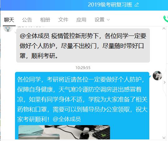 信息学院考研班班主任刘力军老师与各位毕业班辅导员老师在考研群内关心询问同学们的学习和生活情况,提醒同学们要提高疫情防控意识,严格遵循学校疫情防控的要求。老师们暖心的话语,让考研学生们感受到学院的温暖,纷纷表示一定会做好日常个人防护,届时顺利参加考试。