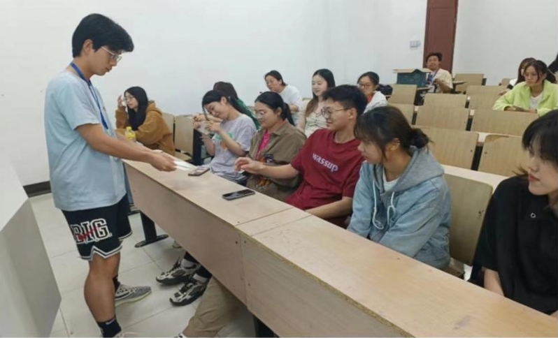“谁是卧底”比赛分为两轮,主持人依次向参赛选手分发卡牌,其中有一位选手拿的是“卧底”牌,拿到“平民”牌的同学们齐心协力,最终成功找到了“卧底”,体现了同学们良好的团队配合能力。