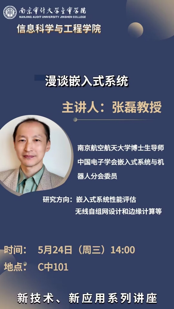为了拓宽学生的视野,增强学生的动手能力和实践创新意识,5月24日下午,信息学院在C中101举办了“漫谈嵌入式系统”讲座,本次讲座由南京航空航天大学博士生导师、金审学院返聘教授张磊博士主讲,旨在深入解析当前嵌入式系统的现状及发展趋势。