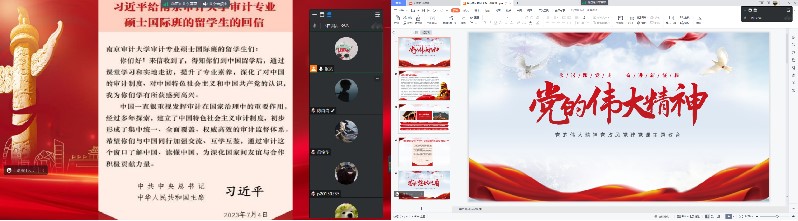 2023年7月15日下午,信息学院分团委召开线上研讨会,展开学习习近平总书记给南京审计大学审计专业硕士国际班的留学生的回信精神。会议首先是分团委副书记马俪珊带领学习习近平总书记对南京审计大学审计专业硕士国际班的留学生回信精神;接着由团员同学发表学习感想,纷纷表示要认真领悟习近平总书记给南京审计大学审计专业硕士国际班的留学生的回信精神内涵,树牢理想信念,坚定不移听党话、跟党走,为实现中国梦而奋斗终身。最后分团委书记冯皓宇老师总结了团员们的学习心得,鼓舞同学们要将学习精神积极投入于接下来的学习和实践之中,并且强调作为大学生要认真学习此次回信所传达的精神,争做新时代的有用青年。