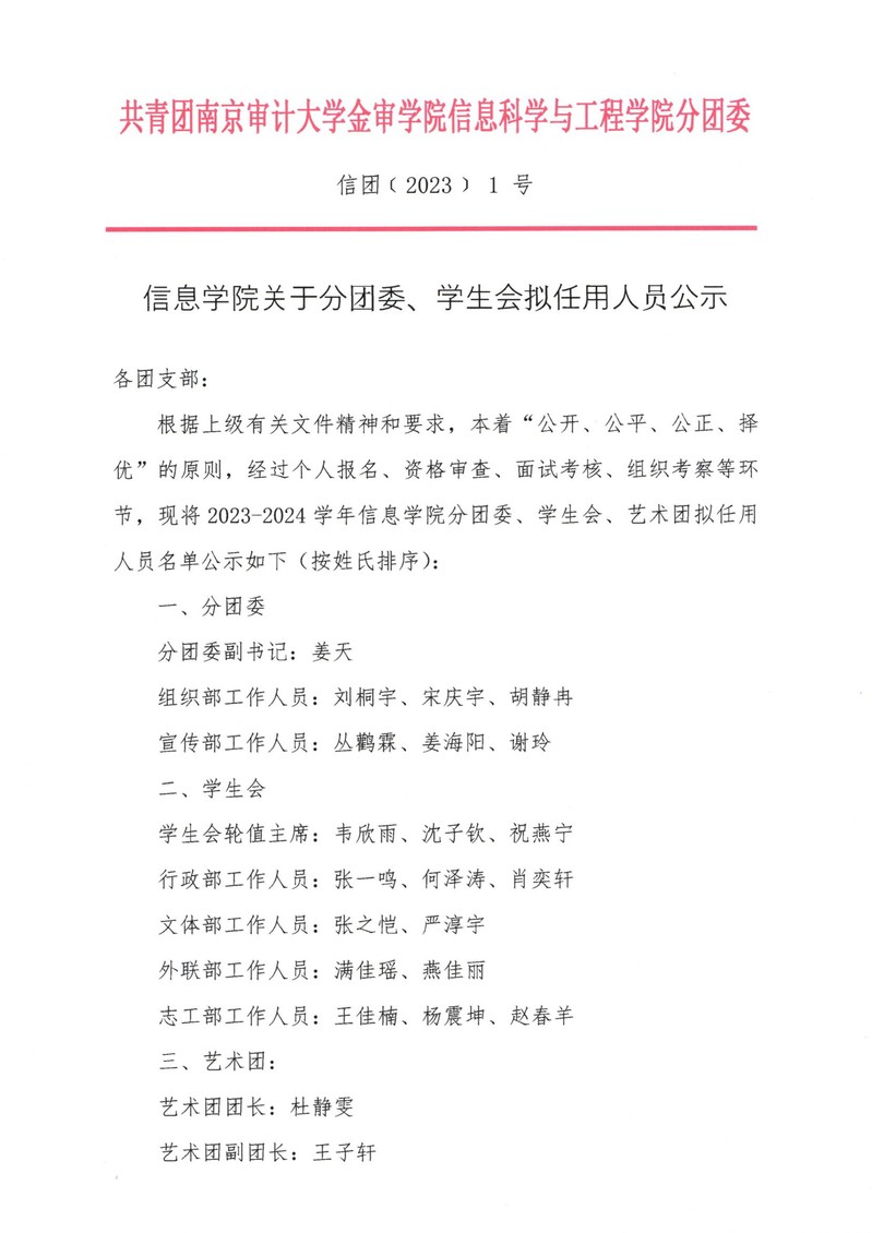 信团﹝2023﹞1号信息学院关于分团委、学生会拟任用人员公示