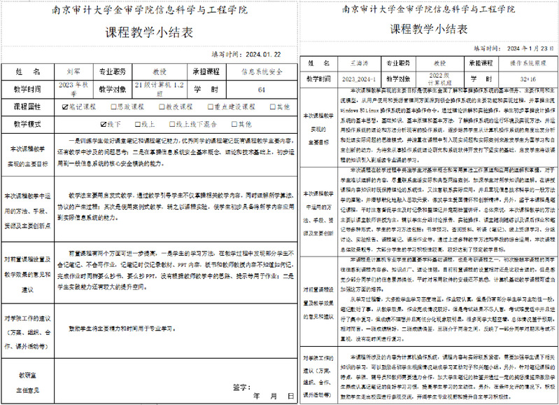 课程小结是信息学院教学运行中的一个重要环节,要求任课老师在课程结束后对教学实际效果与课程目标的抵达度、教学过程中教学方法与手段的运用、教学改革的主要内容、学生学习笔记及其学习方法的指导、课程思政的开展、前置课程的影响等方面进行总结,并在此基础上对课程体系的完善、课程内容与条件建设、课程教学组织优化提出建议。在课程小结分享环节,共分享了刘军、王海涛、葛东旭、王纪萍等十余位老师各具亮点的课程教学小结,使大家从中得到多方面的启发,并就其中一些问题进行了讨论和明确。通过这一环节使学院的新学期教学工作在更高层次上得以开展。