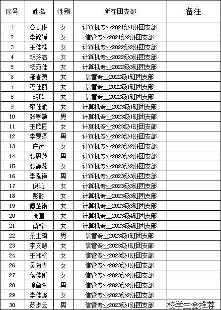 推荐容凯琳等30位同志为入党积极分子。为广泛征求党内外群众意见,决定自2024年4月22日至2024年4月26日予以公示。如对公示对象有不同意见,请以口头或书面形式向我院分团委反映。