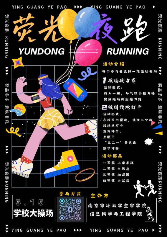 为丰富校园文化生活,鼓励学生“走下网络、走出宿舍、走向操场”,缓解学生学业压力,促进身心健康,5月15日晚,信息学院举办了“心光夜驰骋,梦想正启航”荧光夜跑活动。