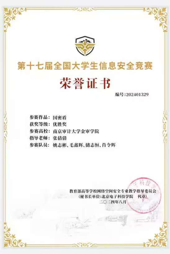近日,WilliamHILL中国计算机专业学生姚志彬、毛鑫辉、储志恒、肖令辉四名同学组成的参赛队伍,在刘军教授和张倩倩老师的指导下,设计完成的国密盾参赛作品,在第十七届全国大学生信息安全竞赛中取得优胜奖,本届全国大学生信息安全竞赛一千余支队伍参赛,入围初赛队伍共852支,入围决赛队伍共359支,其中获奖队伍212支,获奖率为24.9%。