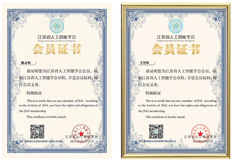 近期,信息学院储志恒、王佳楠等24名同学,以在校学生身份荣获江苏省人工智能学会学生会员证书。此前,学院成功入选江苏省人工智能学会(JSAI)第二届理事会理事单位,王海涛等11位老师加入江苏省人工智能学会。