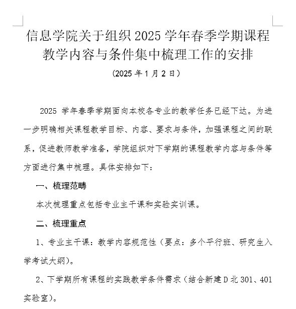 2025年1月9日上午9:00,信息学院于院学术会议室召开了2025学年春季学期课程教学内容与条件集中梳理会,旨在贯通课程联系,加强教学准备,为新学期教学工作夯实基础,不断提高教学质量。