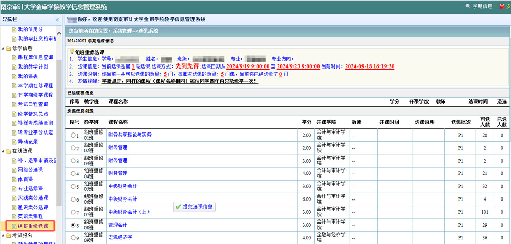 3.跟班重修选课时间:2025年3月3日09:00-3月5日09:00。