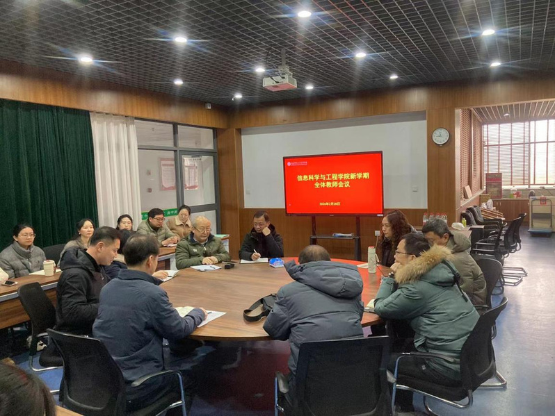 为深入贯彻落实学校新学期工作部署,全面统筹学院各项事业发展,明确新学期工作目标与重点任务,2月28日上午9点,信息学院在一楼会议室召开了新学期全体教师会议。学院院长周俊生、副院长刘军、党总支副书记王志坚和全体教师参加了会议。