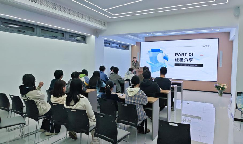 随后,学生代表戴申文结合自身经历分享成长经验。作为智径科技社团骨干,他从专业学习、项目实践、企业实习三方面给出建议:扎实学好编程语言、数据结构等基础课程,积极参与社团项目与学科竞赛,在实践中积累经验;实习时主动学习、快速适应职场,多向前辈请教,在实操中找准职业兴趣与发展方向。他的分享贴近学生实际,让在场同学深受启发。